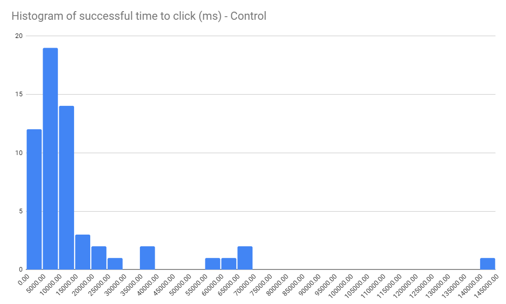 Despite this, I think it's useful to compare time-to-click data between different test variations in a qualitative fashion, i.e. getting a feel for the shape of the responses, and using that in conjunction with success rate, as well as a 'soft' metric – in this case, a Single Ease Question (SEQ).